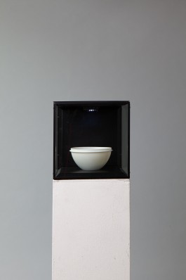 Fotodokumentation präsentiert in Vitrine, Serie, Salzkristalle auf Haaren, Tupperdose, 15 × 15 cm, 2019