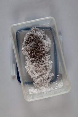 Fotodokumentation Detail, Serie, Salzkristalle auf Haaren, Tupperdose, 33 × 15cm, 2019