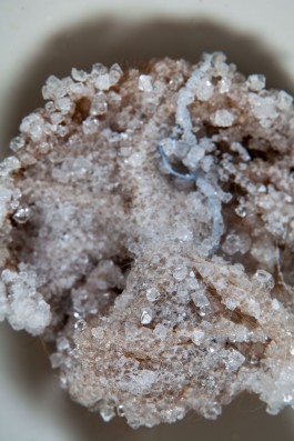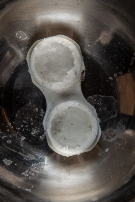Fotodokumentation Detail, Serie, Salzkristalle auf und in Kontaktlinsendöschen, Wasserbad- und Schmelztöpfchen, 2 × 5 cm, 2019