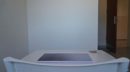 RICHTIGEN REIHENFOLGE, DANN SIEHST DU WAS SICH DAHINTER VERBIRGT, Installationsansicht, Stelltisch mit Fleck, Stellstuhl, Blick an die Wand; DIN A-3, Digital-Druck