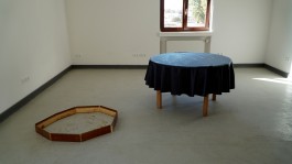 Installationsansicht, Zimmerleisten; Runder Tisch mit Satin Tischdecke