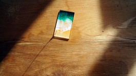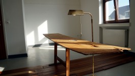 eine aus Wasserflecken marmorierte Holzplatte, Stehlampe über Diasec